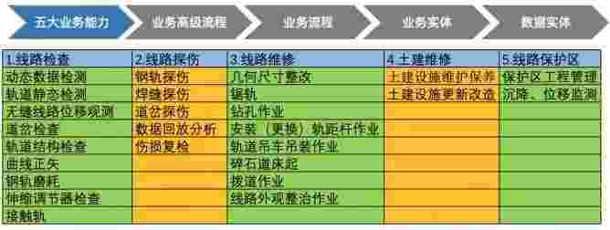 在轨道运维业务中,,,,我们形成了完整的从业务能力(业务域)-业务流程-业务实体-数据模型的分析梳理过程。。。。轨道运维业务能力如下图所示::